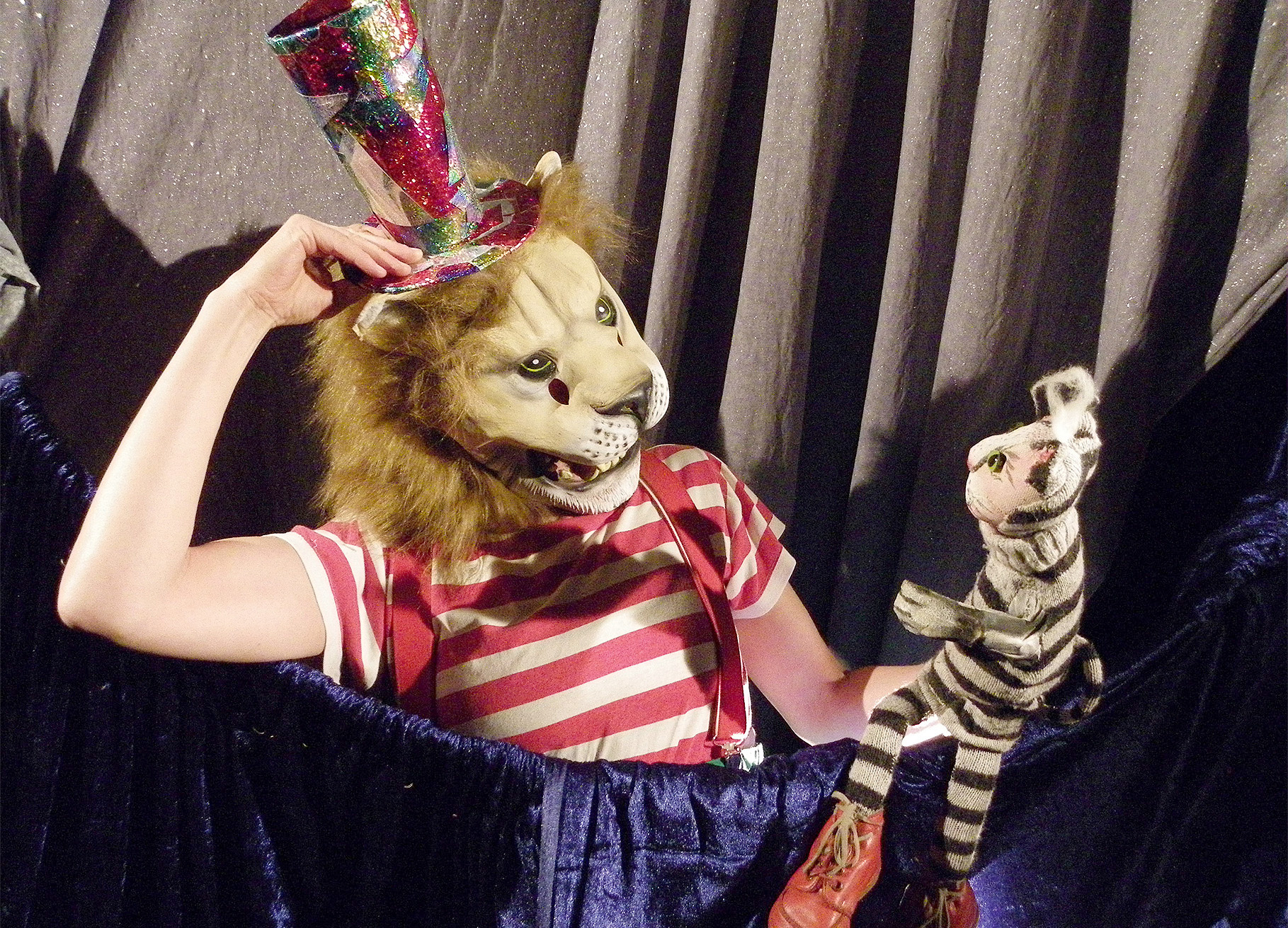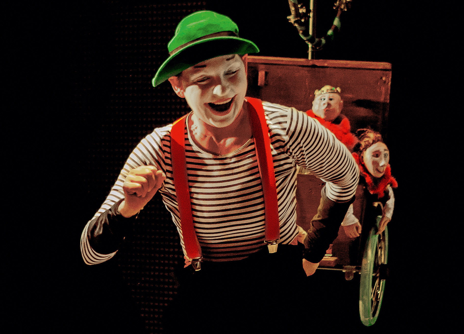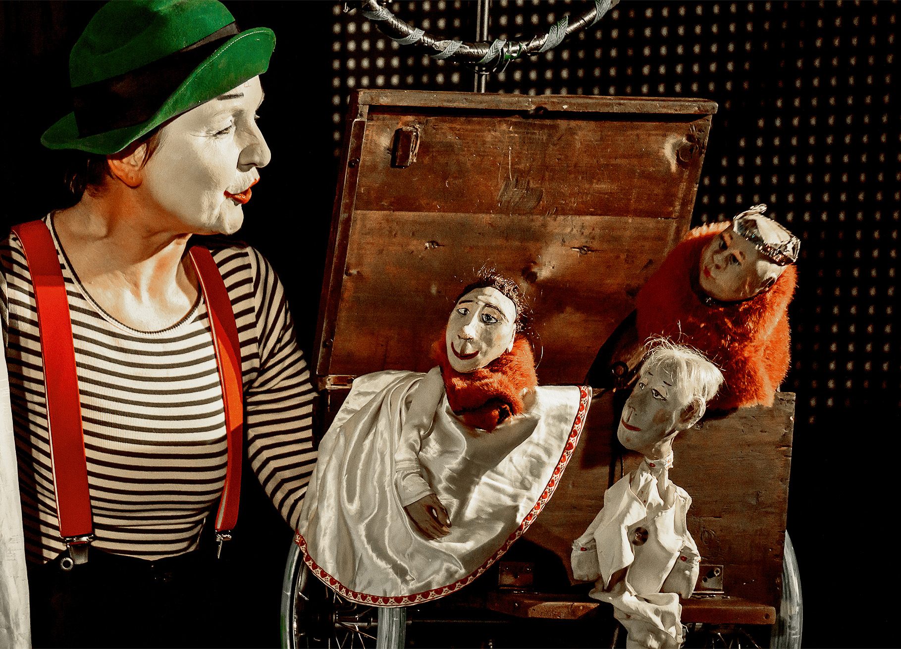 Schnörkelloses Straßentheater! Nur mit einem Koffer voller Requisiten und Improvisationen im Kopf, hinaus aus dunklen Räumen ins Freie, dahin treibt es die Puppenspielerin, weil Wahrhaftigkeit und Tiefe Einfachheit anstreben …